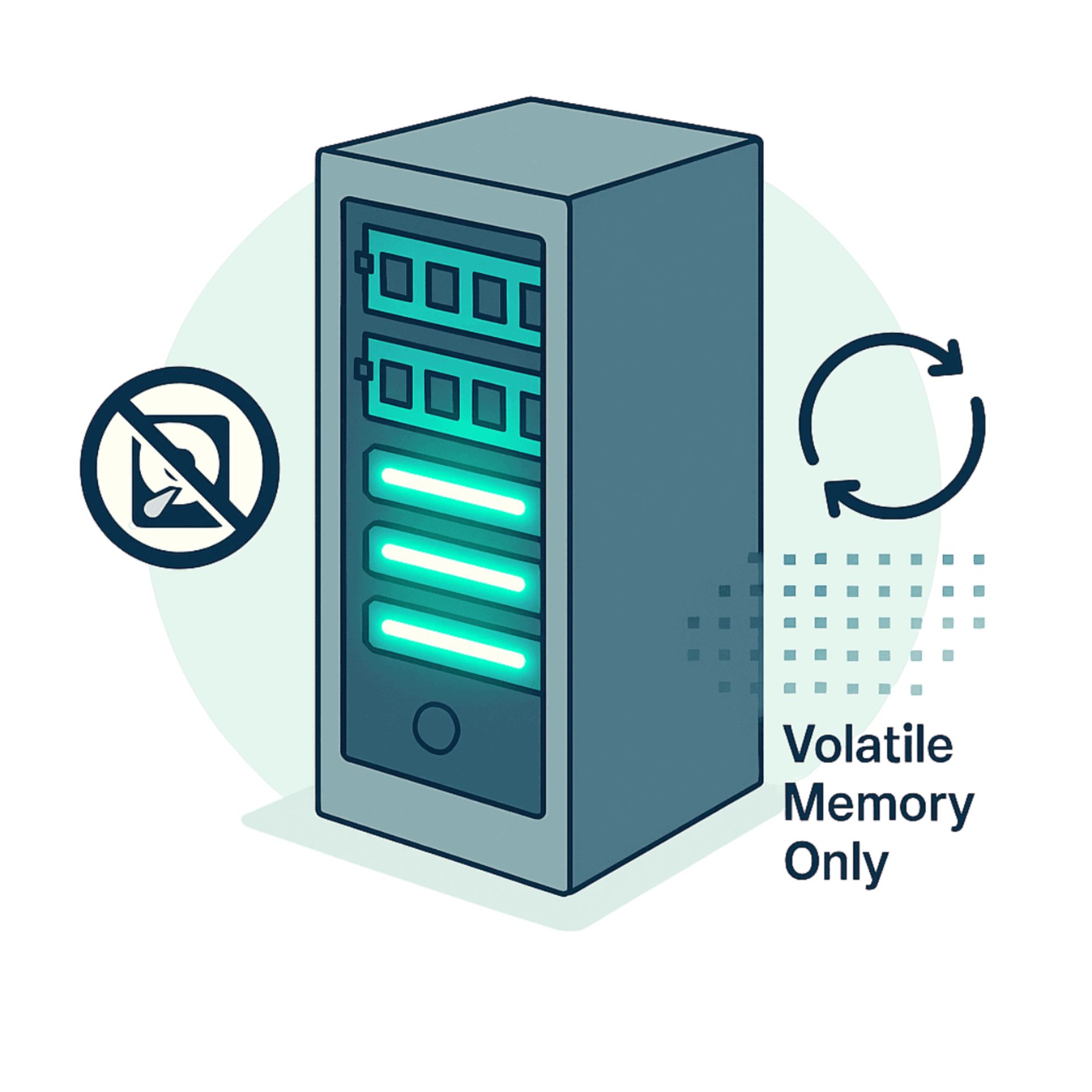 إذا قامت السلطات بمصادرة خادم يعمل فقط بذاكرة الوصول العشوائي (RAM) بشكل فعلي، فلن تجد أي بيانات مستخدم دائمة. في اللحظة التي يُفصل فيها الخادم عن الكهرباء أثناء المصادرة، تُفقد جميع البيانات في الذاكرة العشوائية فوراً وبشكل لا يمكن عكسه. لا توجد أقراص صلبة أو أقراص SSD يمكن استخراج المعلومات منها.