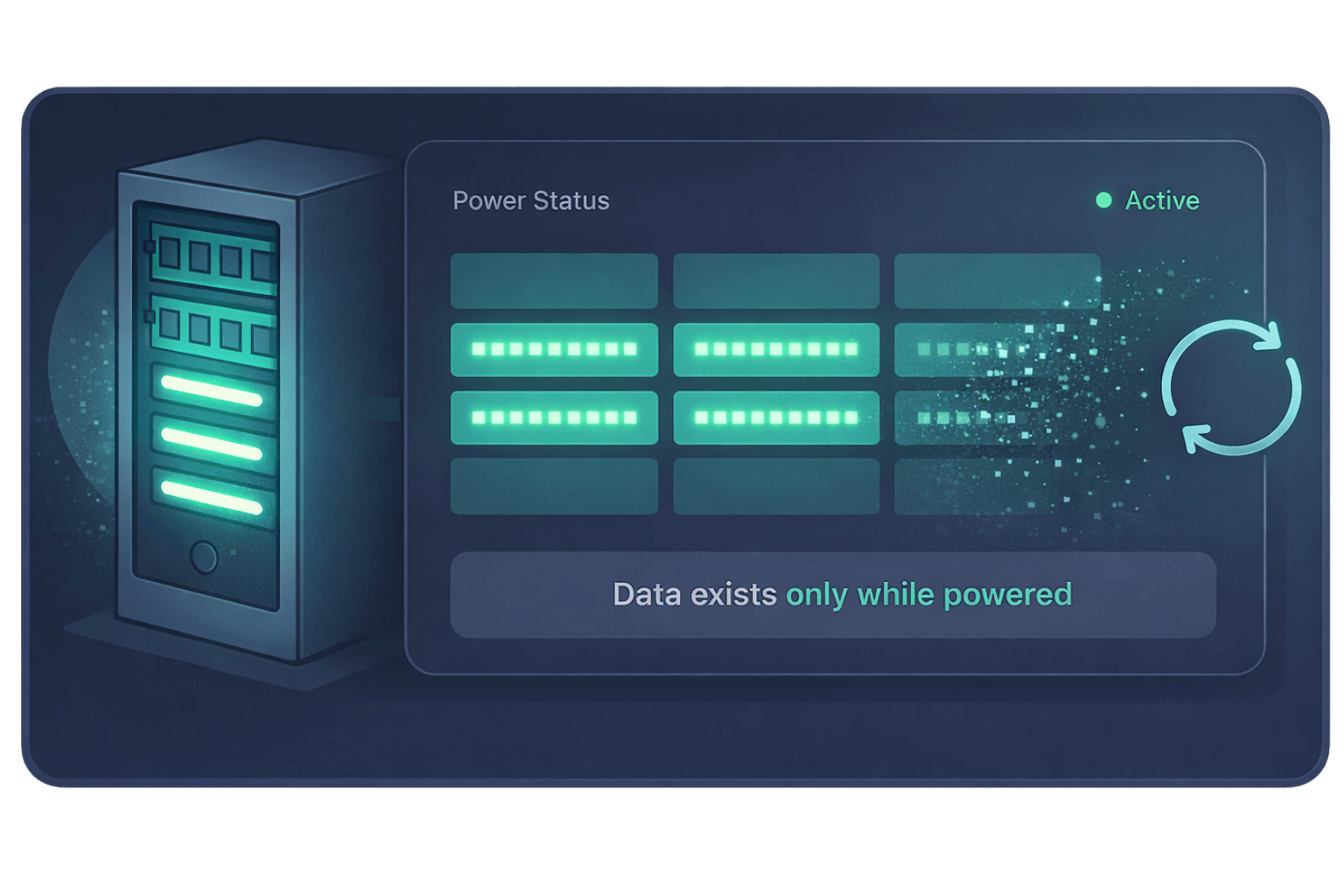 RAM (الذاكرة الوصول العشوائي) يتطلب طاقة كهربائية مستمرة للحفاظ على البيانات. في اللحظة التي تُقطع فيها الطاقة، تختفي جميع المعلومات فوراً—هذه خاصية أساسية في التكنولوجيا، وليست ميزة برمجية يمكن تجاوزها.