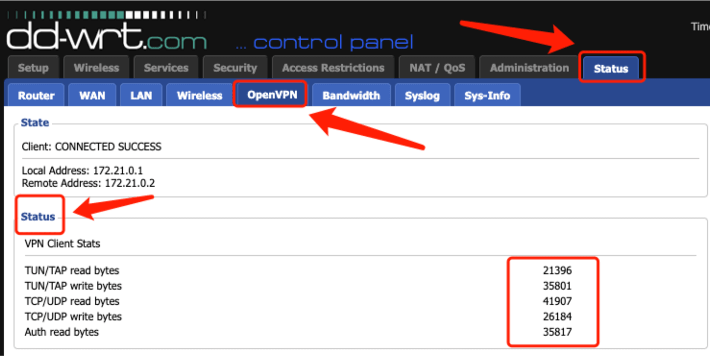 Starten Sie Ihren Router neu und warten Sie eine Minute oder zwei, bis sich alles beruhigt hat. Überprüfen Sie dann den Status des OpenVPN-Clients unter "Status" > "OpenVPN". Wenn die Werte nicht null sind, ist OpenVPN verbunden. Sie können auch diese Website besuchen, um zu überprüfen, ob sich Ihre IP-Adresse geändert hat!