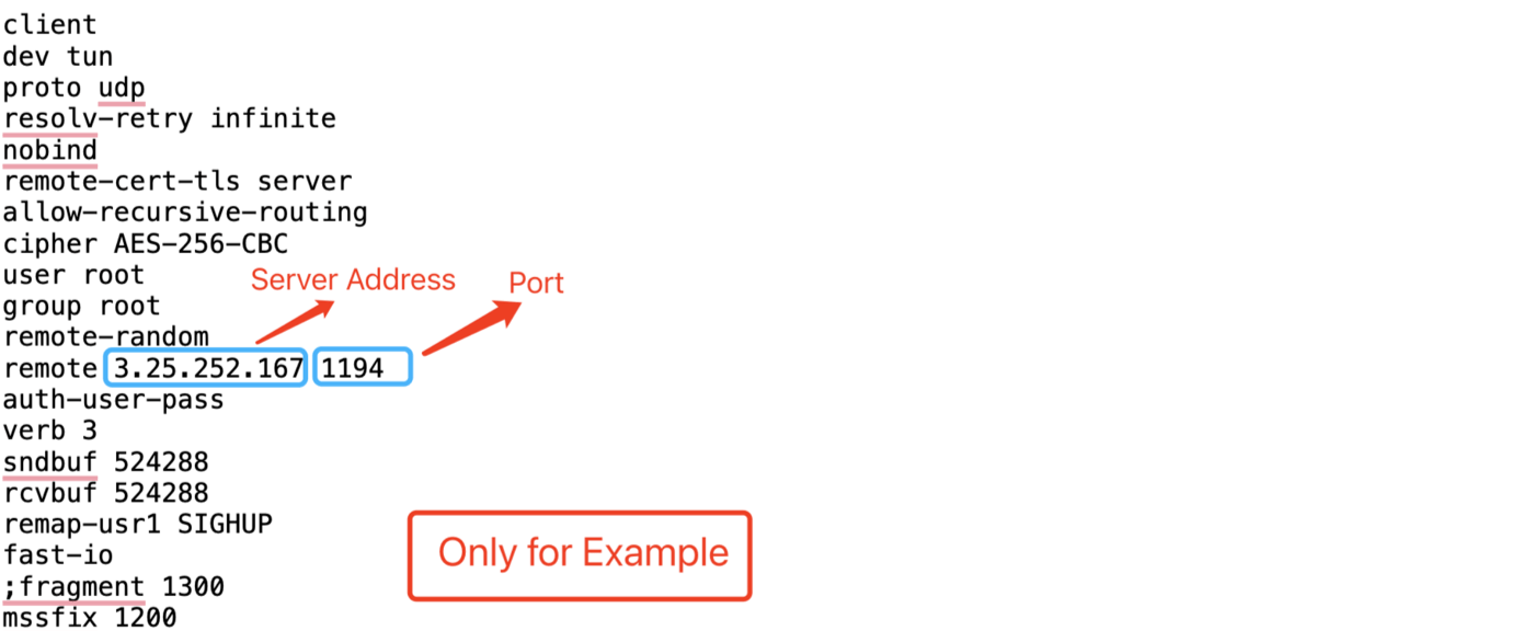 Server IP/Name &Port: Finde es in der [.ovpn]-Datei, die du in Schritt 2 heruntergeladen hast.