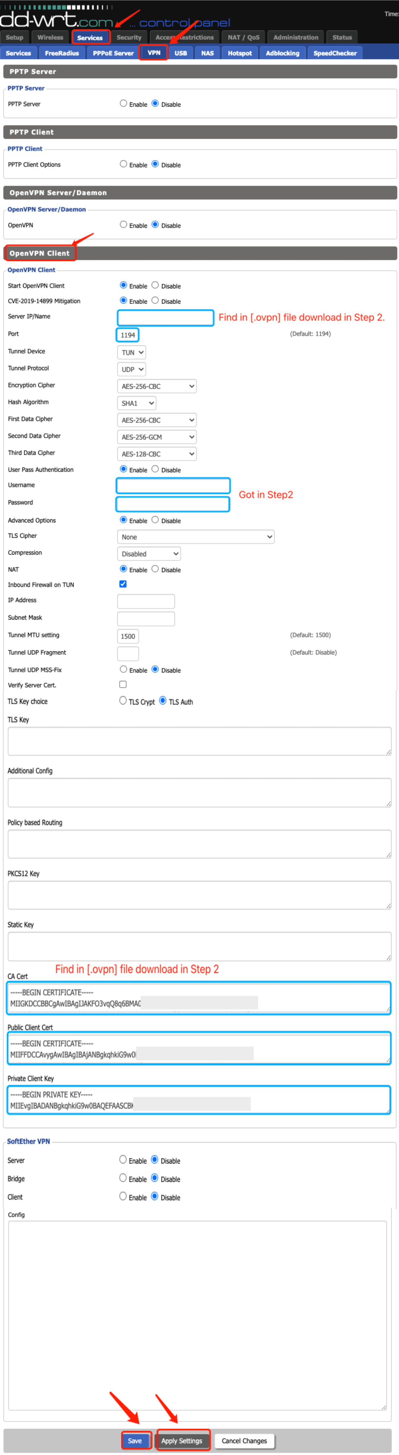 Konfigurieren Sie die folgenden drei "Schlüssel" Felder mit Inhalten in der [.ovpn] Datei, die Sie herunterladen.Schritt 2: