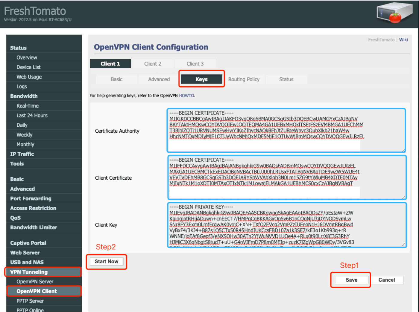 Gut gemacht! Klicken Sie"Speichern"zum Speichern der Konfiguration, dann klicken Sie auf"Jetzt starten"Um OpenVPN zu starten, kann es einige Zeit dauern.