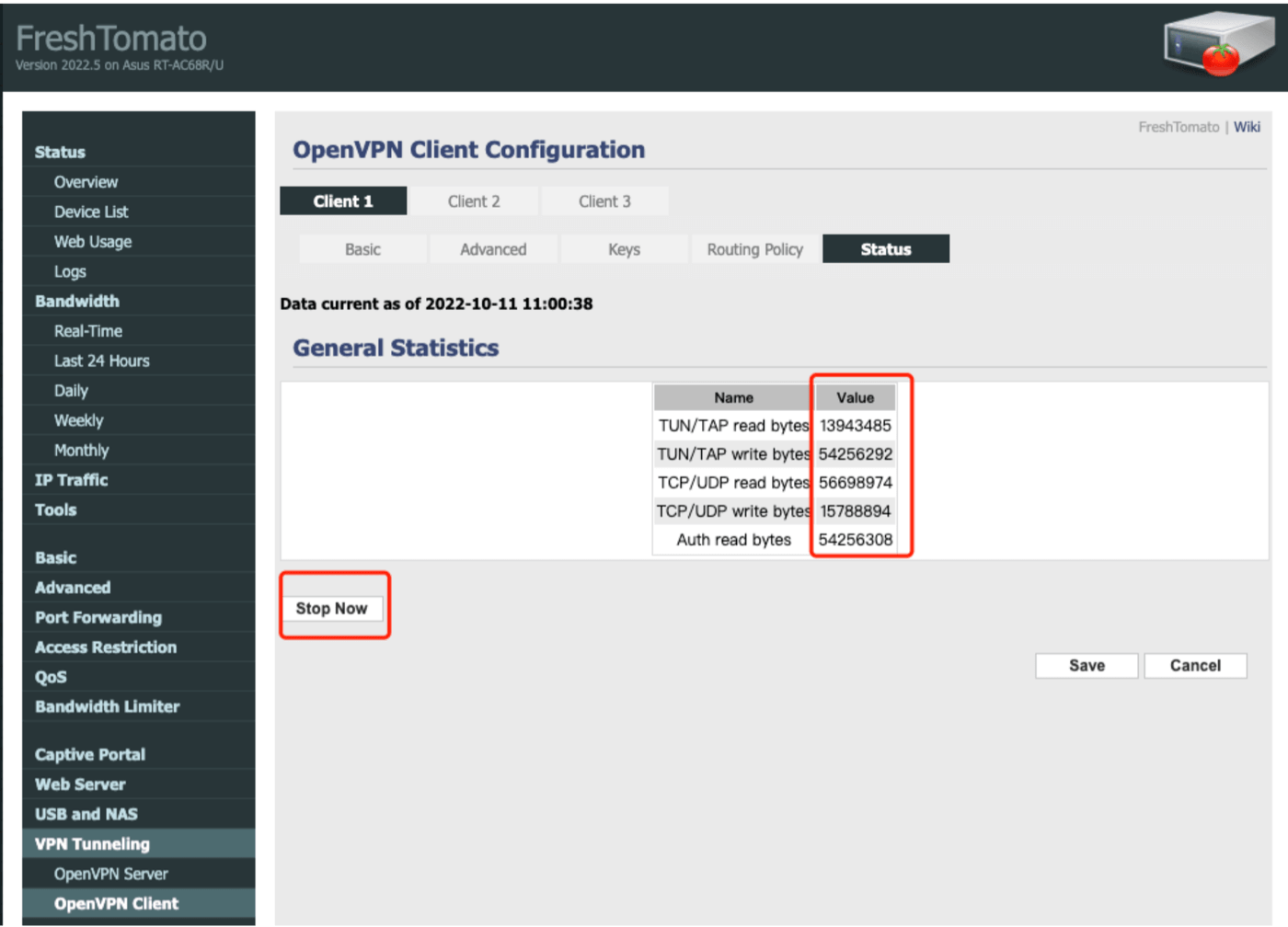 Navigieren Sie zu "VPN Tunneling" > "OpenVPN Client" > "Status", wenn sich die Werte ändern, ist OpenVPN verbunden. Sie können auch diese Website besuchen, um zu überprüfen, ob sich Ihre IP-Adresse geändert hat!