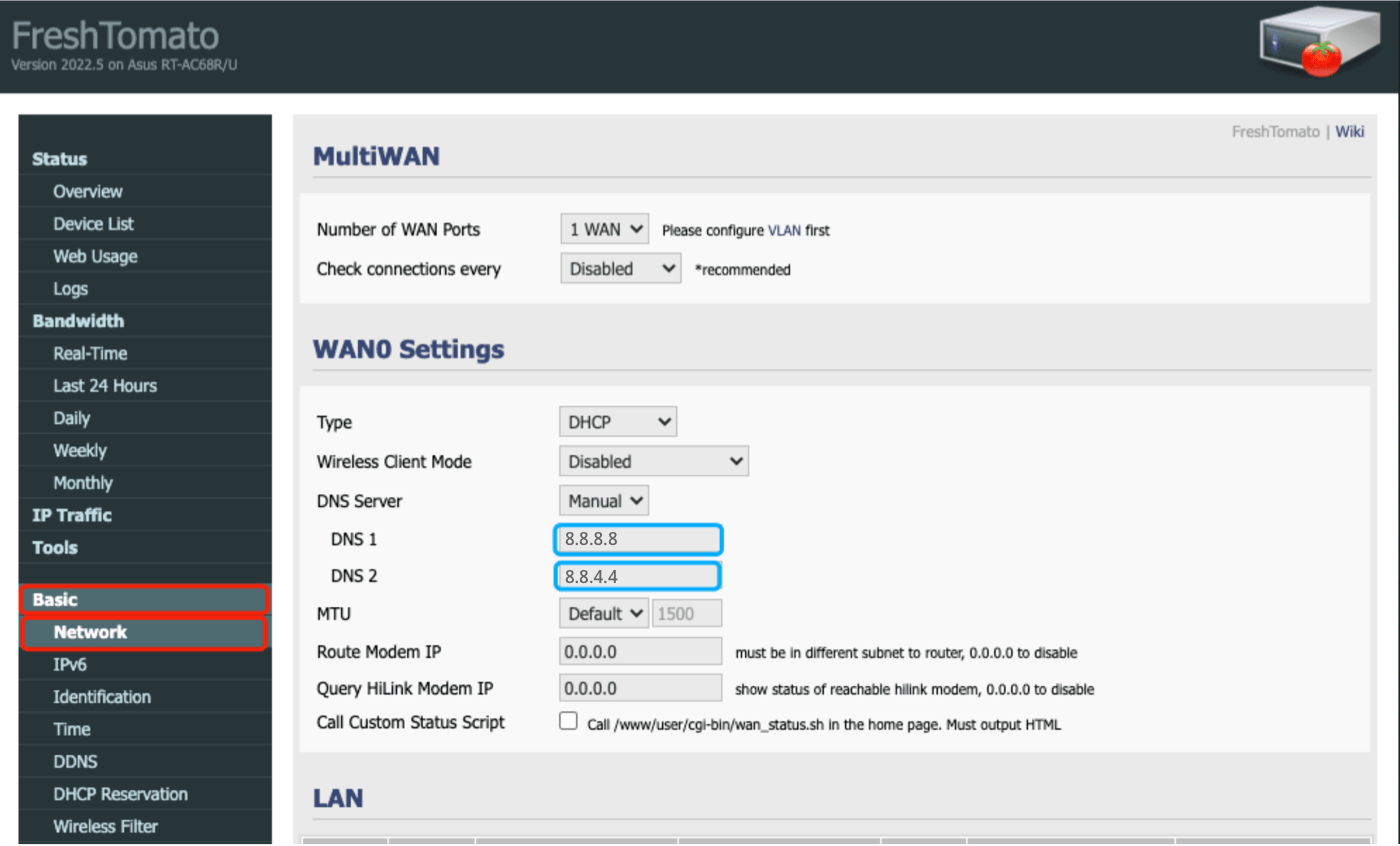 Go to"Basic > "Network"Make sure the DNS server is not blocked, you may fill DNS1 and DNS2 servers with the following open-source DNS servers:8.8.8.88.8.4.4208.67.222.222208.67.222.2208.26.56.268.20.2247.20209.244.0.3208.244.0.4