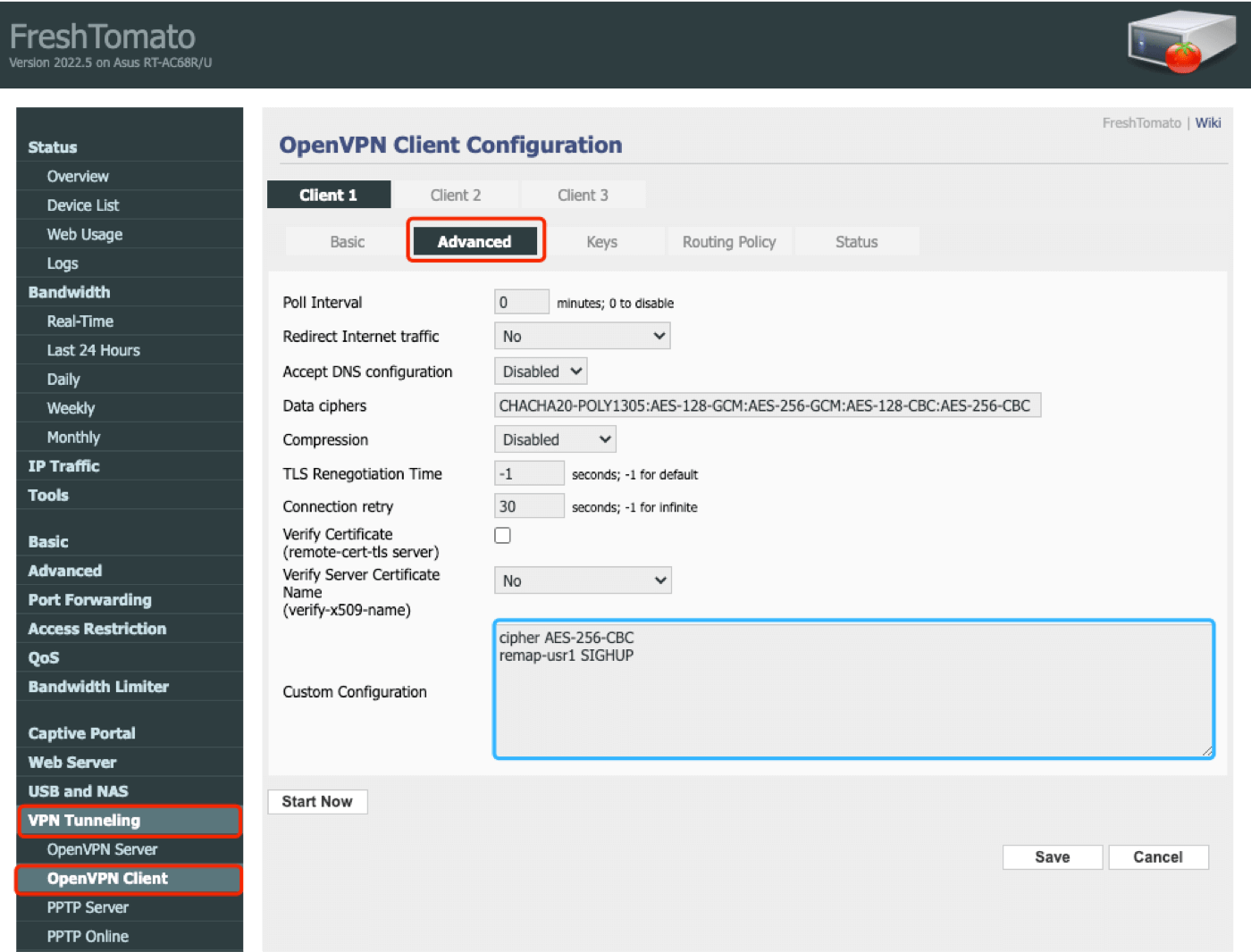 Navigate to "VPN Tunneling" > "OpenVPN Client" > "Advanced"Configure as follows: