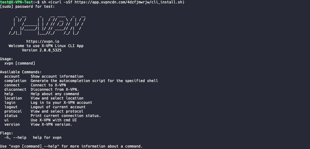 Executing the xvpn command directly to get help content. You'll see all the X-VPN command lines here.
