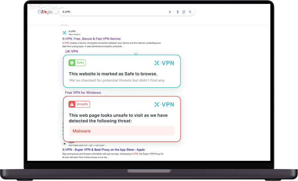 X-VPN adds clear safety icons next to every search result and flags suspicious or malicious pages before you click, so you can spot safe links at a glance and avoid phishing or malware sites.