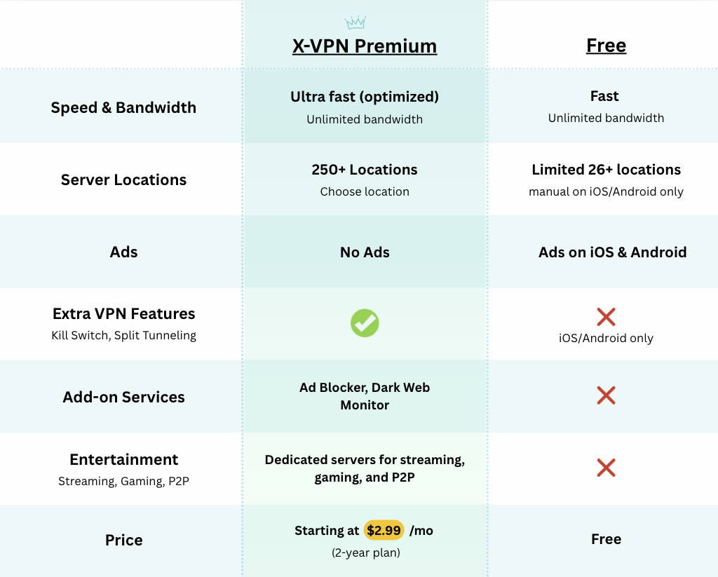 X-VPN Free and X-VPN Premium are built for different needs.