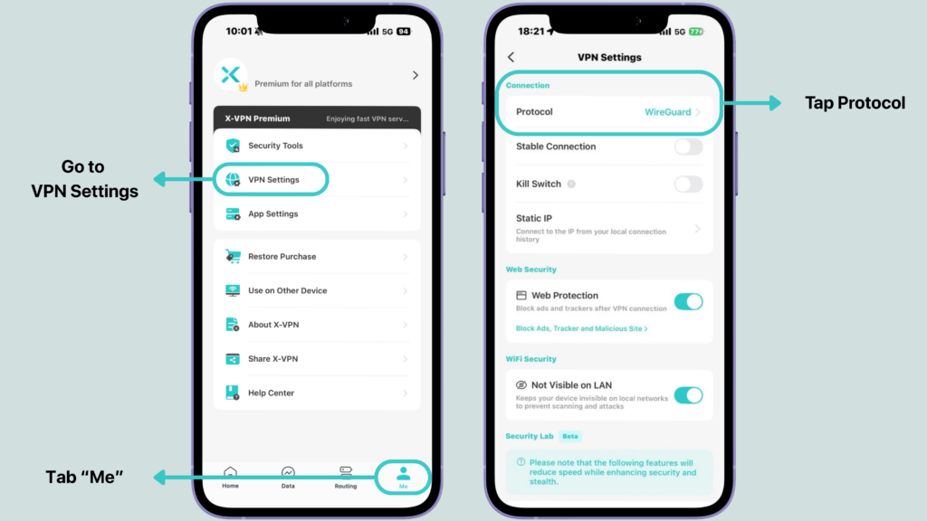 Two new protocol options for X-VPN on iOS, so you can pick an open-source VPN protocol based on what you’re doing.