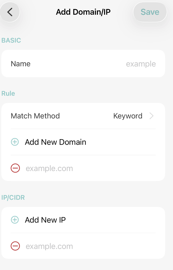 Websites via VPN altında Yeni Kural Ekle seçeneğine dokunduğunuzda, Alan Adı/IP Ekle ekranını göreceksiniz. Bu, VPN üzerinden yönlendirmek istediğiniz herhangi bir web sitesini, IP adresini veya CIDR aralığını manuel olarak eklemenizi sağlar.