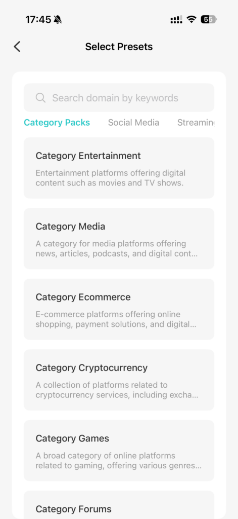 Ön Ayar Seç butonuna dokunduğunuzda, Amazon, BBC, Google, Disney ve daha fazlası gibi popüler web sitelerinin kategorize edilmiş bir listesini göreceksiniz.