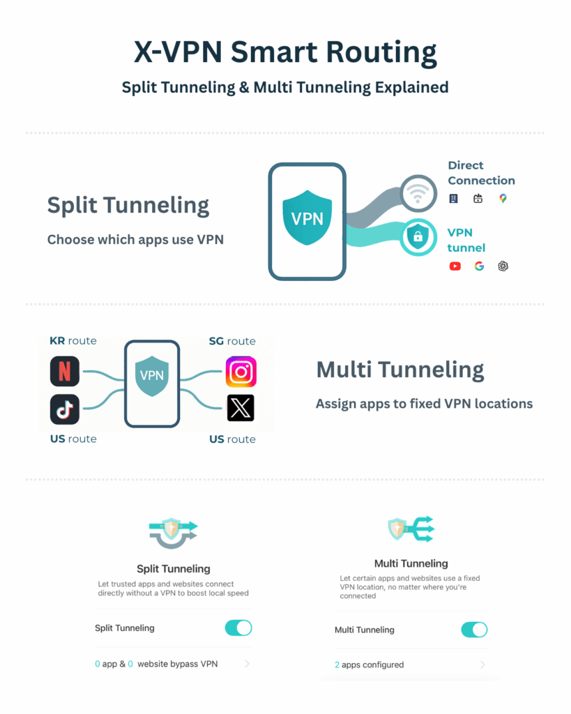 X-VPN, X-VPN Akıllı Yönlendirme ile bunu basit hale getirir; bu, X-VPN Bölünmüş Tünelleme ve X-VPN Çoklu Tünelleme adlı iki özellik tarafından desteklenmektedir.